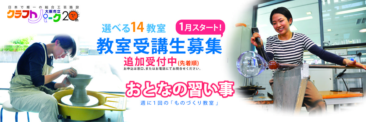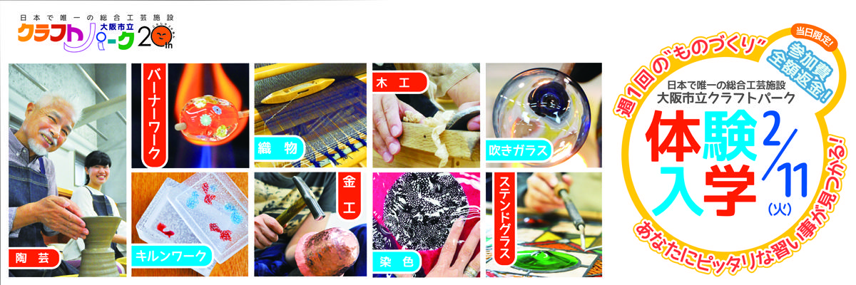 日本で唯一の総合工芸施設 大阪市立クラフトパーク Instagram X Facebook YouTube ホーム アクセス お問合せ06-4302-9210 開館時間9:30~17:00 休館日火曜日・年末年始12/28~1/4