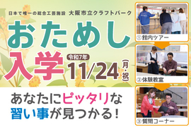 日本で唯一の総合工芸施設 大阪市立クラフトパーク Instagram X Facebook YouTube ホーム アクセス お問合せ06-4302-9210 開館時間9:30~17:00 休館日火曜日・年末年始12/28~1/4